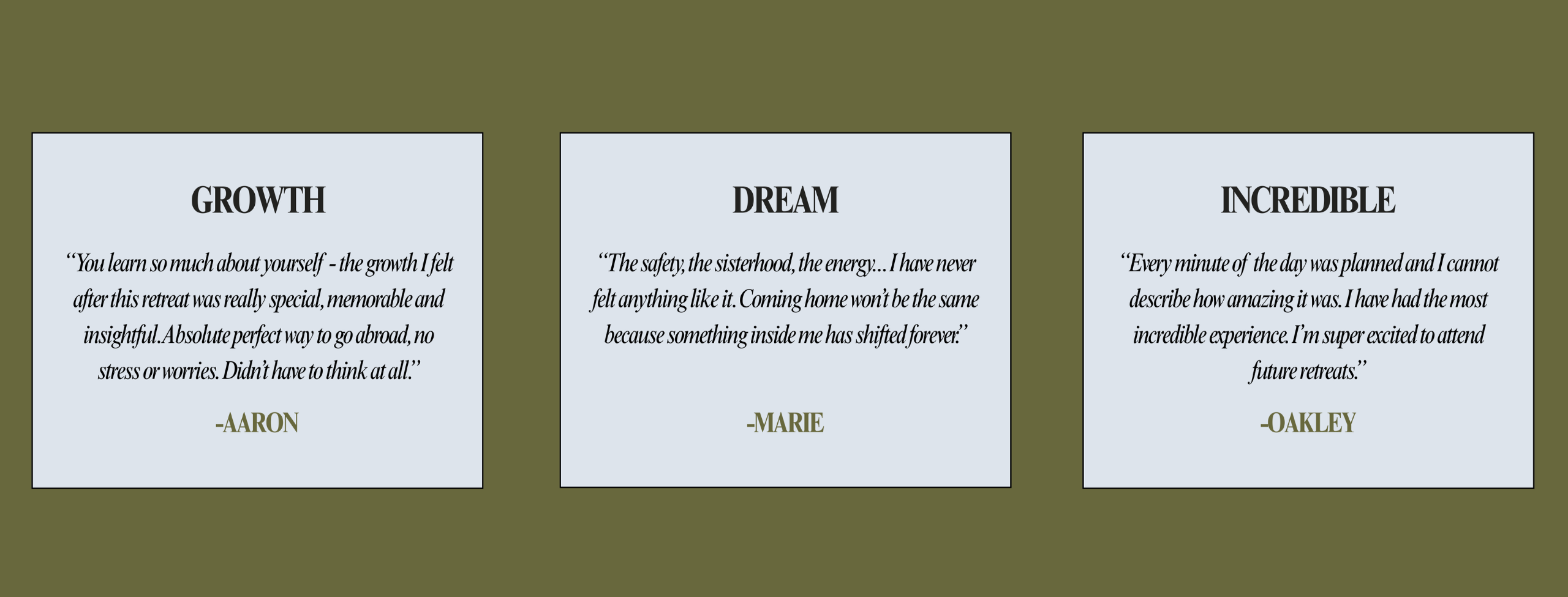 This Retreat isn’t just a ‘trip away’—it’s a full-body remembrance of who you are when you stop playing small with people who encourage you to GO AFTER YOUR DREAMS and be UNAPOLOGETICALLY YOU every single day...